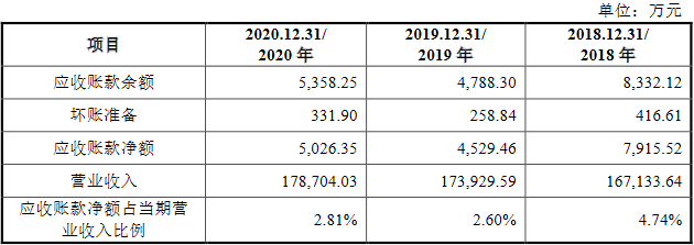 2014年至2020年各期末,腾远钴业应收账款余额分别为4170.76万元、6452.51万元、3207.85万元、4265.47万元、8332.12万元、4788.30万元和5358.25万元;坏账准备分别为208.54万元、322.63万元、160.39万元、213.27万元、416.61万元、258.84万元和331.90万元;应收账款净额分别为3962.22万元、6129.88万元、3047.46万元、4052.20万元、7915.52万元、4529.46万元和5026.35万元,占当期营业收入的比例分别为5.62%、10.86%、4.90%、2.40%、4.74%、2.60%和2.81%。