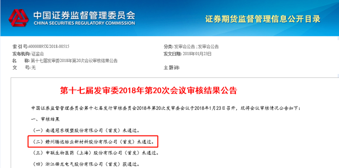 中国证监会网站公布的第十七届发审委2018年第20次会议审核结果公告显示,腾远钴业于2018年1月23日上会,首发申请未通过。
