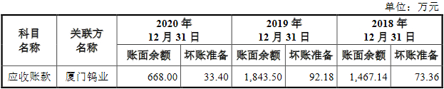 腾远钴业招股说明书显示,公司在2018年末、2019年末及2020年末对厦门钨业存在应收款余额,金额分别是1467.14万元、1843.50万元及668.00万元。