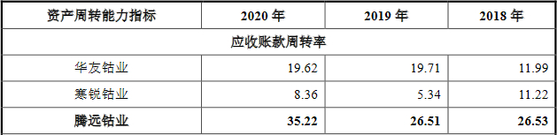 2014年至2020年,腾远钴业应收账款周转率分别为16.92、10.62、12.89、45.09、26.53、26.51及35.22。同期,华友钴业应收账款周转率分别为19.67、13.00、11.95、10.19、11.99、19.71和19.62;寒锐钴业应收账款周转率分别为9.84、12.25、10.49、12.74、11.22、5.34和8.36。