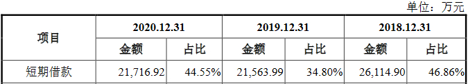 截至2014年12月31日、2015年12月31日、2016年12月31日、2017年12月31日、2018年12月31日、2019年12月31日及2020年12月31日,腾远钴业短期借款分别为1.35亿元、9582.40万元、1.50亿元、3.88亿元、2.61亿元、2.16亿元和2.17亿元,占流动负债的比例分别为79.93%、68.99%、75.10%、65.39%、46.86%、34.80%和44.55%。