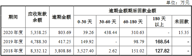 2018年至2020年,腾远钴业应收账款逾期金额分别为3808.86万元、417.25万元和803.69万元。其中,报告期内,逾期0-30天期后回款金额分别为3527.40万元、149.92万元和39.26万元,逾期30-60天期后回款金额分别为2.62万元、0元和438.44万元,逾期60-180天期后回款金额分别为151.02万元、98.79万元和310.63万元,逾期180天以上期后回款金额分别为127.82万元、168.54万元和0元。