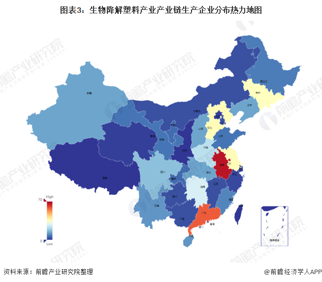 2、生物可降解塑料产业链区域热力地图:安徽省企业数量最多