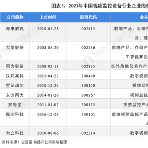 视频监控设备是安防行业的细分专业领域,近年来,视频监控业务正在向其他领域加速渗透。视频监控设备行业的上市公司包括:海康威视(002415)、大华股份(002236)、大立科技(002214)、汉邦高科(300449)、世纪瑞尔(300150)、东方网力(300367)、安居宝(300155)、同为股份(002835)、振芯科技(300101)。