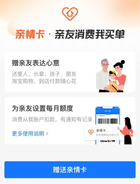 一旦开通亲情支付,对方无论是在线上还是线下消费时,支付渠道大都可选择为亲情卡。在每月额度范围内,对方消费,将从亲情支付赠与方账户自动扣款。