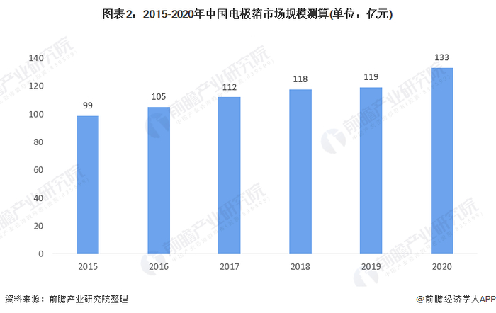 据测算,2015-2020年中国电极箔市场规模呈上升趋势,2020年中国电极箔市场规模约为133亿元。