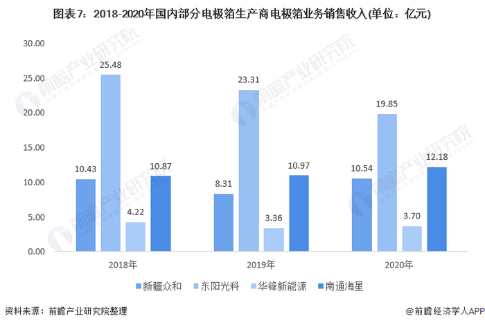 根据国内主要电极箔生产商发布的财务数据显示:2020年新疆众和电极箔销售收入为10.54亿元;东阳光科电极箔销售收入为19.85亿元; 2020年华锋新能源电极箔年销售金额为3.7亿元;南通海星电极箔业务营业收入为12.18亿元。
