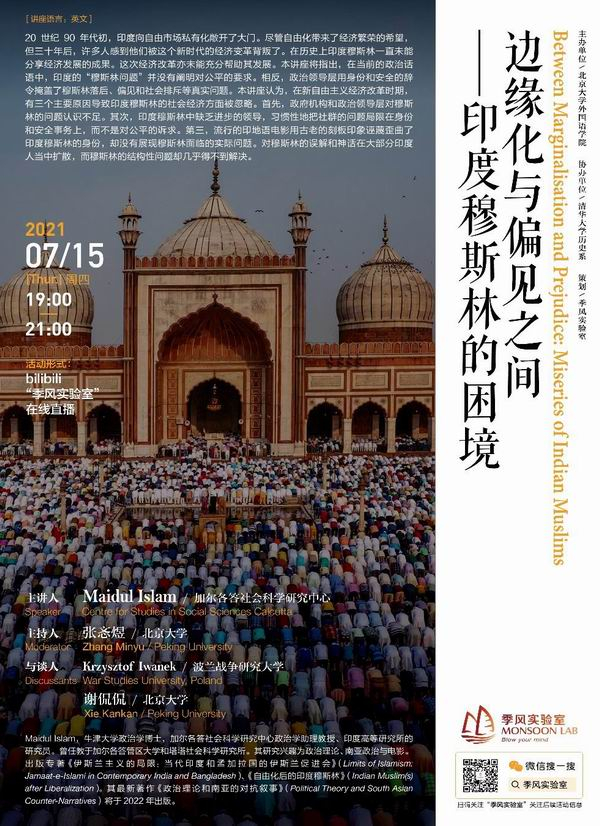 本文整理自2021年7月15日由北京大学外国语学院主办讲座——“边缘化与偏见之间:印度穆斯林的困境”(Between Marginalisation and Prejudice: Miseries of Indian Muslims)。讲座由印度加尔各答社会科学研究中心政治学助理教授麦杜尔·伊斯拉姆(Maidul Islam)主讲,北京大学外国语学院国别和区域研究专业助理教授张忞煜主持,北京大学外国语学院东南亚系助理教授谢侃侃与谈。