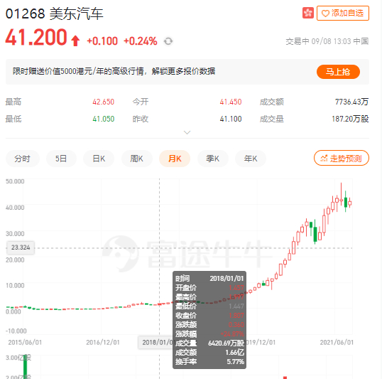 汽车经销商美东汽车(01268.HK)是去年股价涨幅最大的新能源车个股。以2018年8月股价最低1.56港元/股计算,美东汽车最高涨至48.4港元/股,最大涨幅超过27倍。