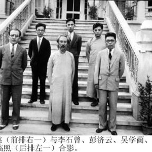 严济慈(前排右一)与李石曾、彭济云、吴学蔺、钟盛标、钱临照(后排左一)合影。