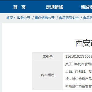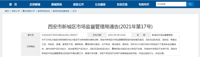 西安市新城区市场监管局抽检108批次食品 4批次不合格