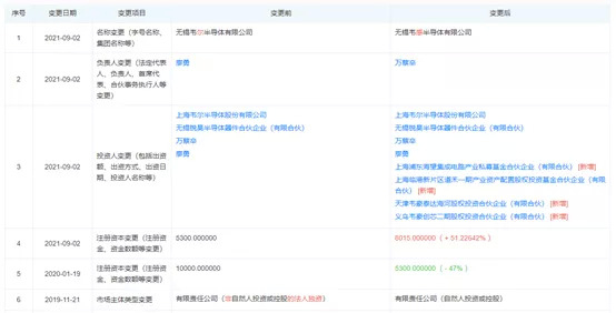 值得注意的是,在上述控股权变更消息公布前不久,9月2日,公司的名称发生变更,从“无锡韦尔半导体有限公司”变更为“无锡韦感半导体有限公司”,且引进了许多新的股东。无锡韦感似乎在淡化与韦尔股份的关系。