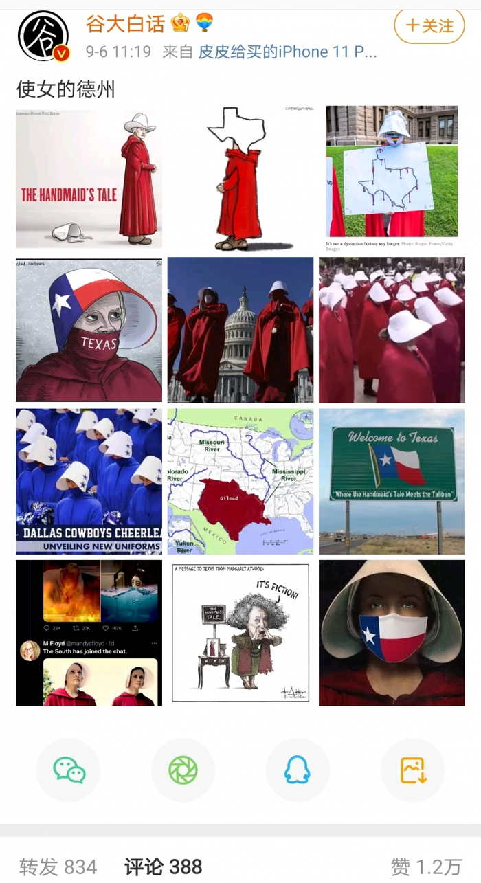 法案生效后,当地不少民众走上街头表示抗议,互联网上也掀起了一阵风暴。当地时间9月2日,一张“达拉斯牛仔啦啦队新队服”的照片在推特上广为流传(编者注:达拉斯牛仔是得克萨斯州达拉斯市的美式橄榄球队),图片上的“啦啦队队员”身着美剧《使女的故事》中的长袍和翼帽,“以此抗议反堕胎法的生效”。9月6日,一名微博大V用户同样引用了该图片,并配文“使女的德州”(编者注:指得州)。