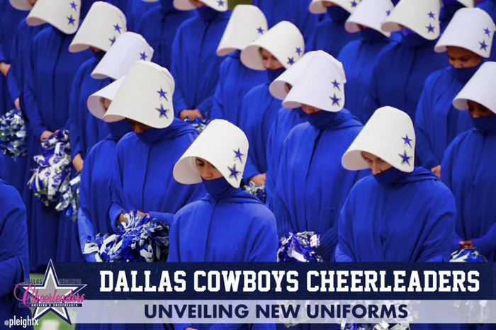 由原图右下角的水印可以发现,图片最早是一名叫做“Paul Leigh”的推特用户发布的,其个人简介显示,他是一名“梗图”创作者。这张图片是将原剧中的红色长袍替换成了达拉斯牛仔啦啦队的蓝色,并在使女帽上添加了啦啦队的星星标识,同时还给使女配上了啦啦球。图片发布后,贝特·迈德尔(Bette Midler)、莉·汤普森(Lea Thompson)等美国女演员、歌手纷纷转发,在《使女的故事》中饰演劳伦斯主教的布莱德利·惠特福德(Bradley Whitford)也在个人推特中引用了该图片。