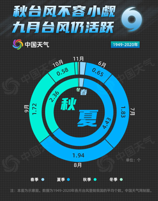 秋季中,9月最活跃,平均登陆个数达到1.72个,仅次于台风活动最频繁的8月(1.94个)和7月(1.83个),差异较小。