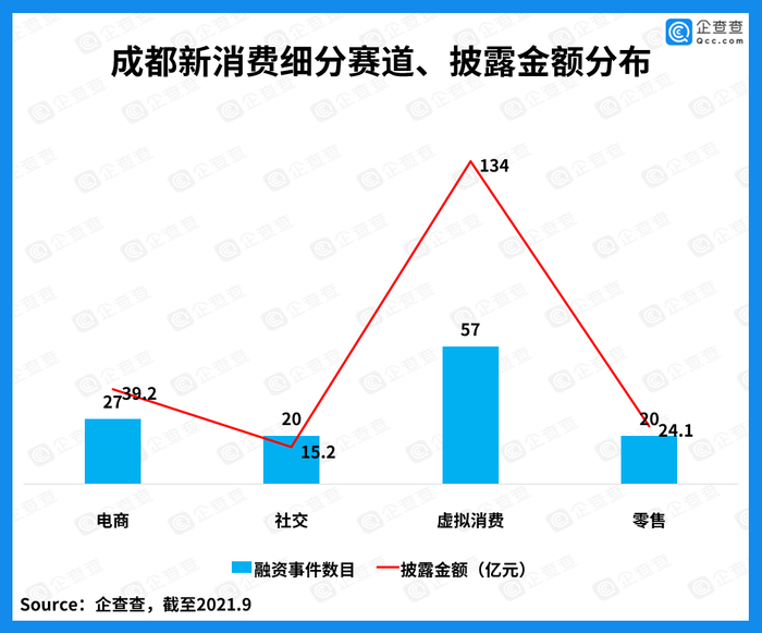 在成都近几年的新消费赛道中,品牌类目层出不穷。企查查数据研究院发现,成都的社交、虚拟消费、电商、零售4条细分赛道较为火爆。
