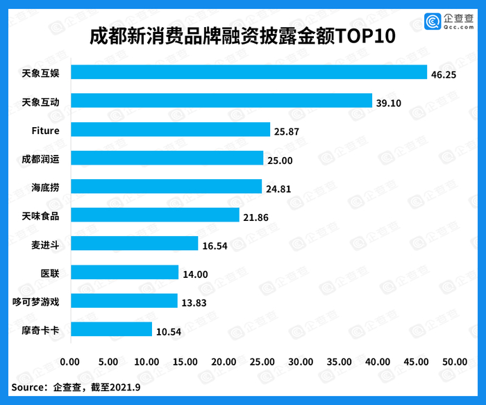 企查查数据显示,在披露金额排行中,“天象互娱”以46.25亿人民币排名第一,是一家移动游戏公司。在前十中,有4个品牌与游戏相关,其中“哆可梦游戏”、“摩奇卡卡”吸金都超过了10亿元;有2个品牌与食品相关,其中海底捞作为国内知名火锅品牌,以24.81亿元排在第五位。此外,运动健身品牌“Fiture”获得了25.87亿元的融资排名第三。