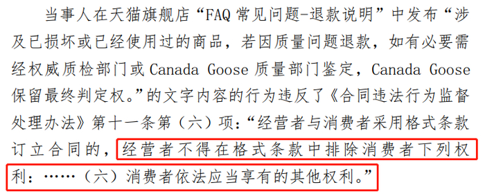 另外,行政处罚决定书指出,加拿大鹅官方天猫旗舰店在“退款说明”中发布“涉及已损坏或已经使用过的商品,若因质量问题退款,如有必要需经权威质检部门或加拿大鹅(Canada Goose)质量部门鉴定,加拿大鹅(Canada Goose)保留最终判定权。”