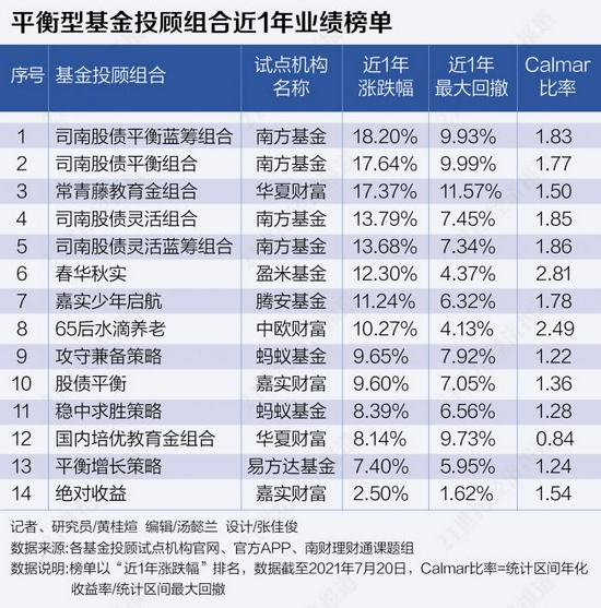 从收益指标来看,截至7月20日,平衡型基金投顾组合近一年平均收益率为11.44%。南财理财通课题组统计,同期平衡混合型基金平均收益率为19.40%。相比之下,平衡型基金投顾组合未跑赢平衡混合型基金。