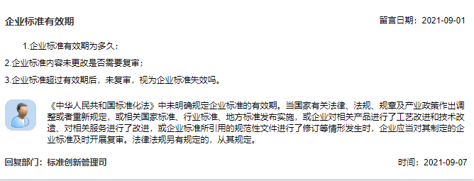关于企业标准有效期的问题,市场监管总局近日作出回复。