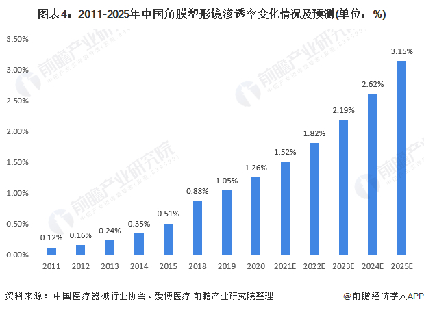 根据中国医疗器械行业协会发布的数据,推算出中国角膜塑形镜渗透率,2011年,我国8-11岁的青少年近视患者选择角膜塑形镜治疗方式的比例仅有0.12%,到了2015年增加到0.51%。鉴于2011年-2015选择角膜塑形镜治疗方式的比例增长率远超过20%,2015年后保守按照渗透率增长率为20%/年计算,爱博医疗测算2018-2020年角膜塑形镜在全国8-18岁近视青少年中的渗透率,2020年渗透率也仅有1.26%;预计到了2025年渗透率将达到3.15%。