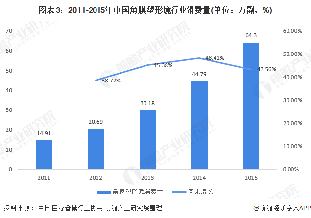 在中国青少年近视率不断提高与日渐迫切的视力改善需求下,角膜塑形镜近年来在我国高速发展。据中国医疗器械行业协会眼科及视光学分会统计,2015年我国角膜塑形镜销量达到64.30万副,2011年至2015年复合增长率约为44.11%。