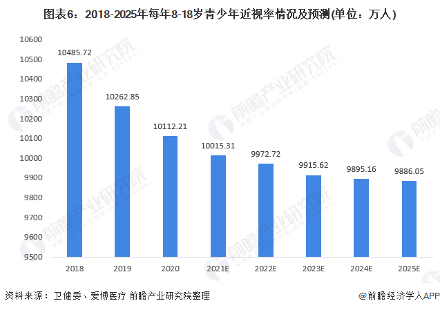 根据卫健委发布的《2018年全国儿童青少年近视调查结果》:我国青少年(从幼儿园到高中)总体近视率为53.6%,其中6岁儿童为14.5%,小学生为36%,初中生为72%,高中生为81%,以及教育部数据所显示的青少年近视比率及防控目标:小学生近视率下降到38%以下,初中生近视率下降到60%以下,高中阶段学生近视率下降到70%以下,爱博医疗预期2018年-2025年每年8-18岁青少年近视率如下图: