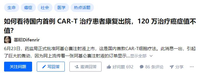知乎 - 如何看待国内首例 CAR-T 治疗患者康复出院, 120 万治疗癌症值不值?