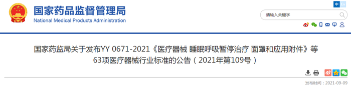 国家药监局关于发布YY 0671-2021《医疗器械 睡眠呼吸暂停治疗 面罩和应用附件》等63项医疗器械行业标准的公告(2021年第109号)