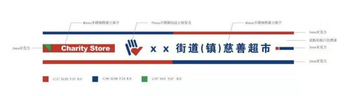 “慈善超市”中英文名称分列左右两侧;中间由“手”字意向化组成,连接两侧“慈善超市”。“手”的意向化构成:手指代表“未来”+掌心则代表“爱心”。蕴意慈善超市以“爱”为主题,关爱群众于身边日常。