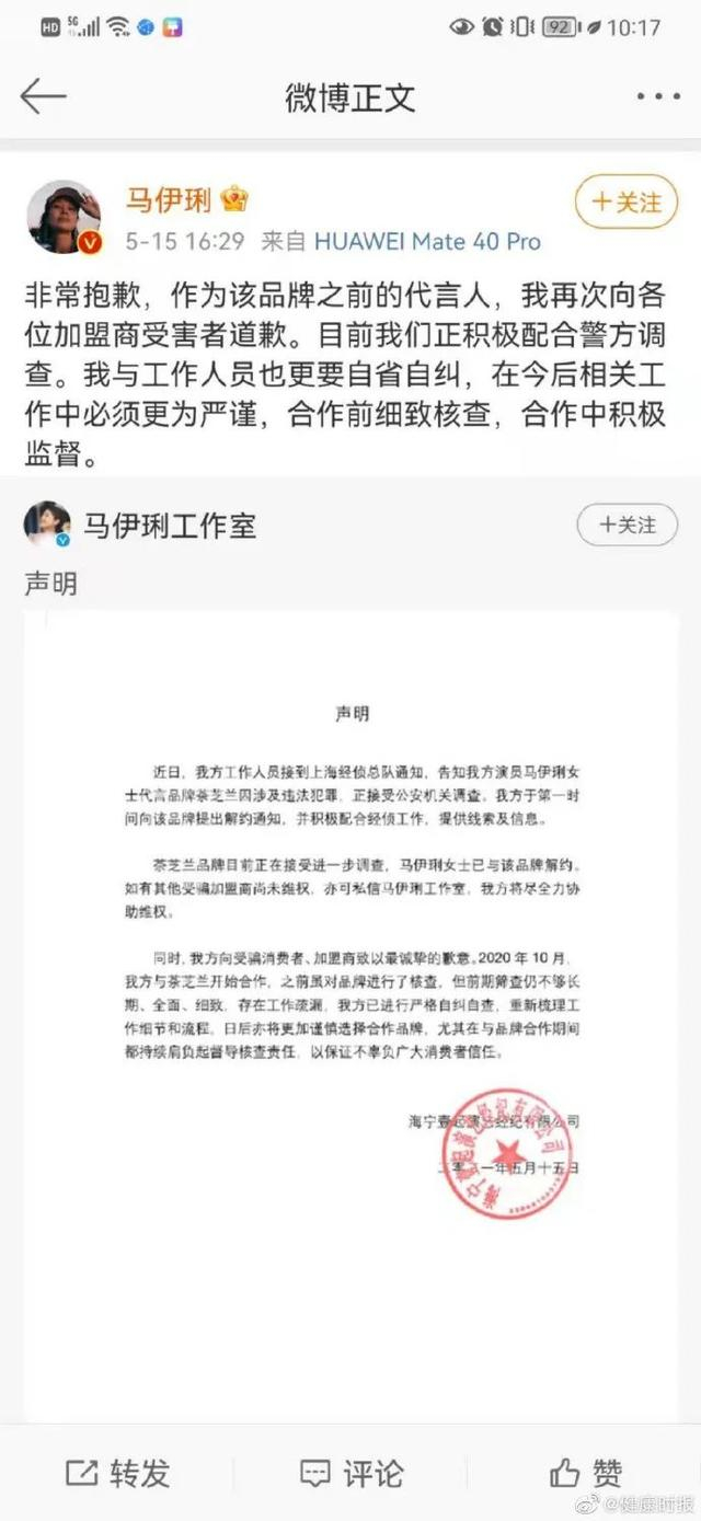 2021年5月15日下午,马伊琍及其工作室就此前代言的“茶芝兰”奶茶品牌涉及违法犯罪一事发布道歉声明。声明中称近日接到上海经侦总队相关通知后,已于第一时间与该品牌解约,并表示如有其他受骗加盟商未维权,亦可私信马伊琍工作室,将尽全力协助维权。
