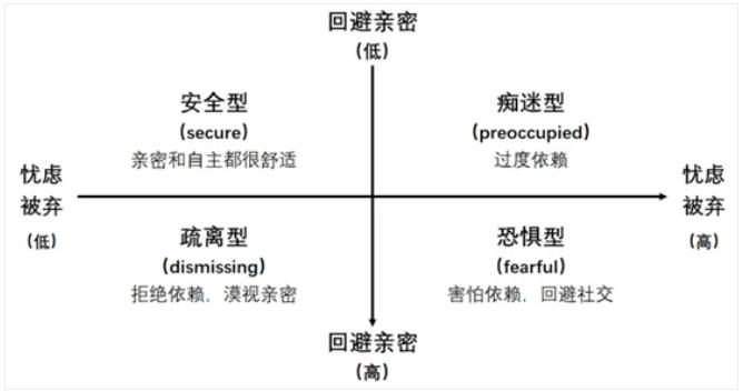 有研究者把成人在恋爱中的依恋风格分为四类:安全型、痴迷型、疏离型、恐惧型。