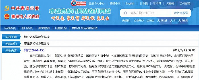其次是城市更新时必然面对的城市记忆问题。2019年7月,有网友在青岛市政府网络在线问政平台上提出,能否在改造棚户区、城中村的过程中,保留旧村庄的牌坊、水井等历史印记,“为这些标志在城市化的汪洋大海中存留方寸土地”。