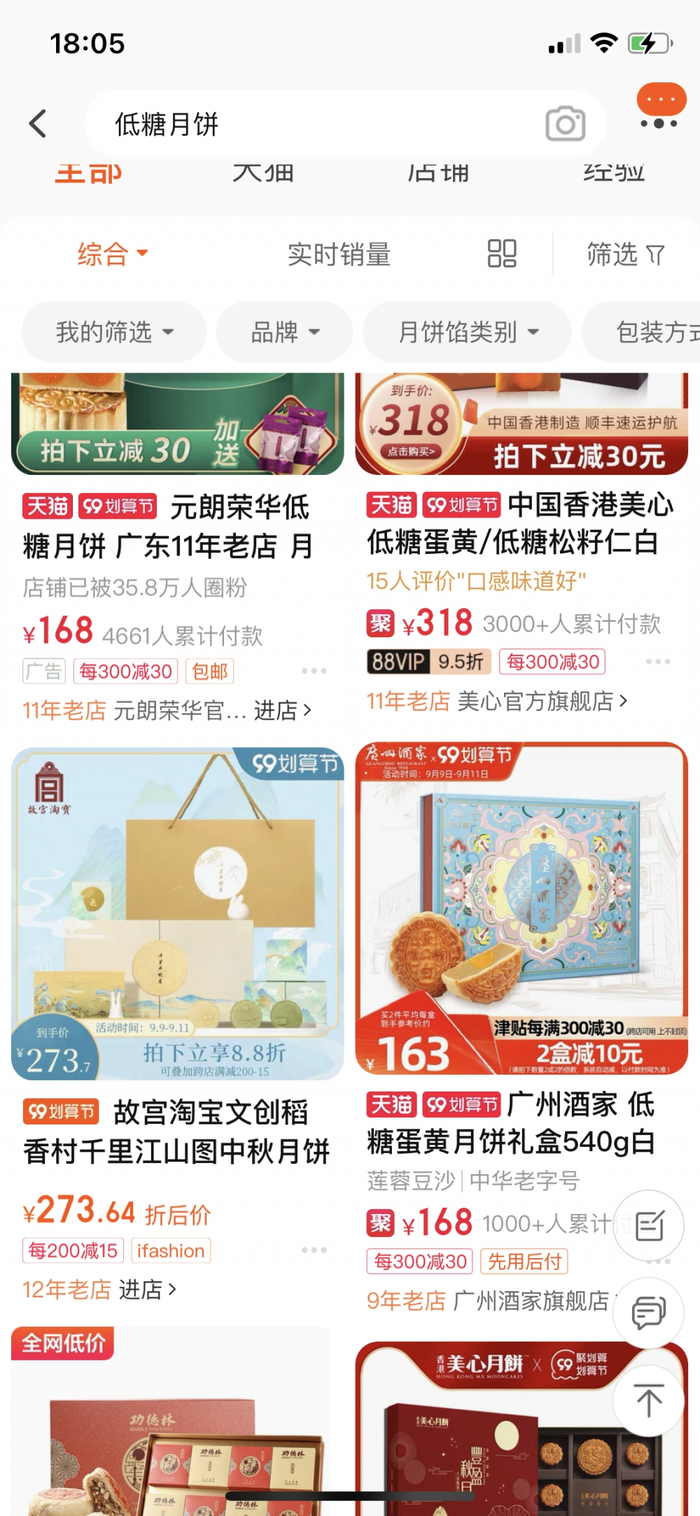 减脂风潮持续火爆,低糖、低脂早已成为月饼营销主打概念。9月9日,时代周报记者发现,冠以“低脂低糖”概念月饼礼盒充斥在淘宝、京东等电商平台,其中不乏美心、广州酒家、佳宁娜等知名品牌。