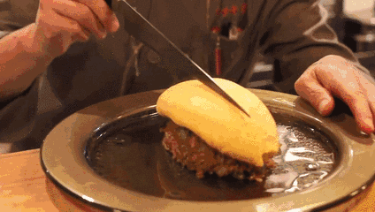 蛋包的蛋液一定要现打,放锅里煎的时候要用筷子快速划圈保持温度均匀。等到蛋液处于咖喱状和液状混合的时候,就可以通过颠锅调制成蛋包形状。