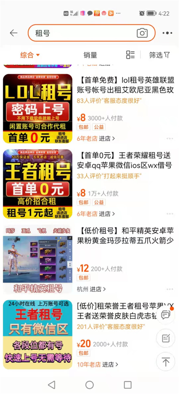 随着防沉迷系统加严,出租游戏号的产业开始蠢蠢欲动。记者在各大电商平台和手机应用商店中搜索“游戏租号”,可以找到大量卖家。