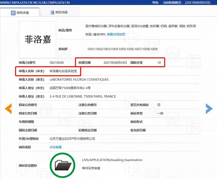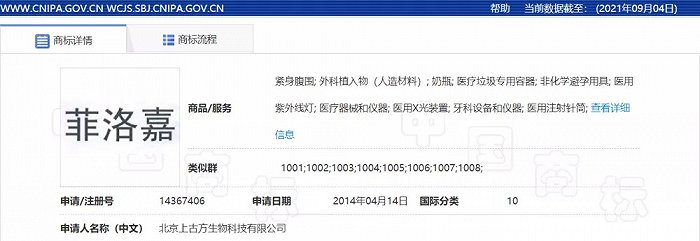 中国商标网信息显示,目前注册号为14367406的“菲洛嘉”10类(医疗器械)商标处于“撤销/宣告无效申请审查中”状态。