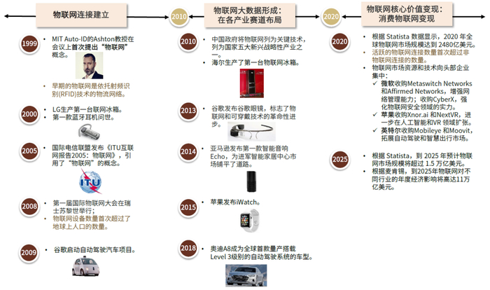 物联网概念不断成熟,“硬件品类拓展+场景智能”催生消费级物联网市场成长机会。1999年,物联网概念被首次提及,将物联网范围界定于物流网络,然而伴随算力提升与通信技术成熟等因素催化,物联网概念不断扩展外沿,我们看到:1)科技公司持续拓展消费级IoT品类:自2000年以来,包括蓝牙耳机、联网冰箱、AR眼镜、智能音响、智能手表等,多种多样的终端被赋予智能化与网联化的功能;2)科技公司持续布局固定场景下的物联网技术:2014年亚马逊的智能音响为消费电子公司带来了智能家居场景下万物互联的想象空间,2020年起自动驾驶浪潮兴起,汽车“新四化”有望成为道路场景下的物联网范例。