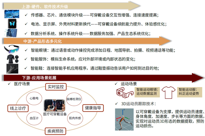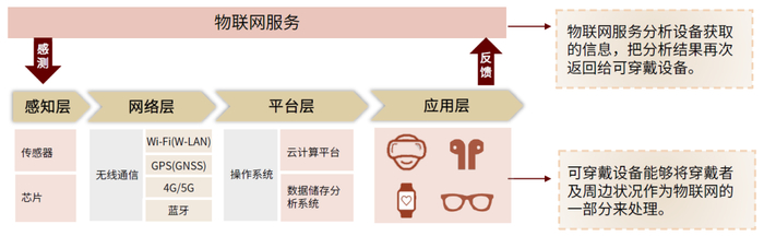 可穿戴设备产品迭代得益于物联网技术不断升级。我们看到,物联网的应用层对应了可穿戴设备终端产品,而物联网的感知层、网络层、平台层分别为可穿戴设备提供了传感芯片、通讯模块、操作系统等基础服务。我们认为,随着传感技术、通信技术、数据分析系统等物联网技术的升级,可穿戴设备将逐渐发展出便携性、高传感性、持续数据监测等性能,为消费者提供高度交互、健康监测、生活娱乐等功能应用。