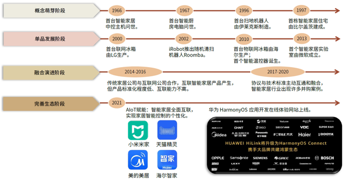 智能家居正步入生态完善期,基于家庭场景的智能互联持续出现。通过梳理智能家居相关的发展历程,我们看到智能家居概念自上世纪起便开始逐步萌芽,至2000年,智能家居单品种类开始日渐丰富,智能冰箱、智能电视、智能空调、扫地机器人等产品走入普通家庭,但仍存在终端设备兼容性差、碎片化等弊端。2015年前后,传统家居公司与科技企业开始共同入局智能家居生态:苹果推出HomeKit、京东搭建JD+平台、海尔推出U+云平台等,智能家居开始逐渐从简单的控制向硬件与平台融合的互联控制体系演进。我们认为,智能家居行业将从2021年开始步入生态完善阶段,智能家居品牌商将加强平台生态建设,逐步实现全面互联。