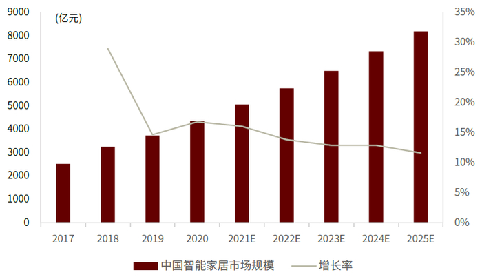图表:中国智能家居市场规模及预测