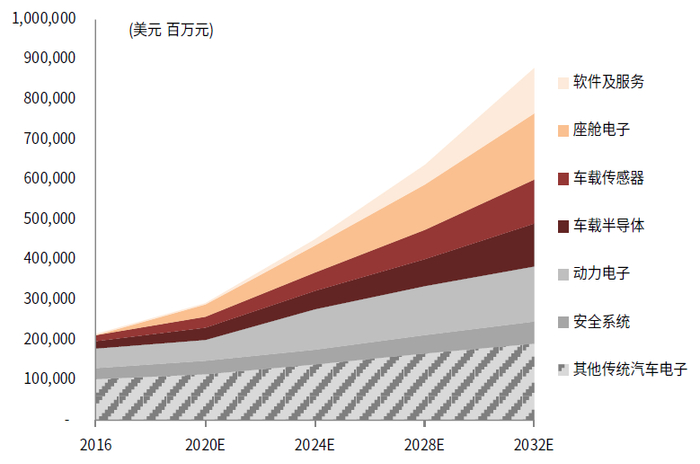汽车电子潜在市场规模超过智能手机,成为AIoT时代的下一个热门终端应用。当前全球智能手机市场规模约为五千亿美元。我们预计到2032年,全球汽车电子市场规模有望达到8,786亿美元(2020-2032 CAGR 10%),其中车载半导体(包含汽车芯片和功率器件等)市场规模有望达1,084亿美元(2020-2032 CAGR 11%),智能化节奏明显。我们认为,智能汽车在未来十年有望沿电动化、智能化、网联化、共享化主线依次展开,并在整车品牌/主要厂商、整车制造、零部件/软件服务等环节带来深刻变革,相比传统汽车时代,更大体量的公司有望诞生,出行的“场景智能”成熟在即。