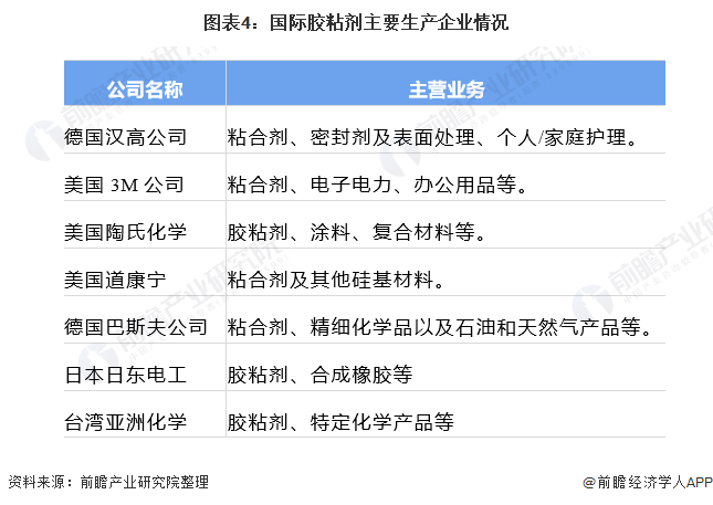 目前,全球主要胶粘剂供应商包括:3M公司、胶粘剂研究公司、Ashland公司、阿克苏诺贝尔、巴斯夫SE、陶氏automotive、伊士曼化学公司、汉高公司、瀚森特殊化学、亨斯迈聚氨酯、ITW高性能聚合物消费部门、PPG等等。