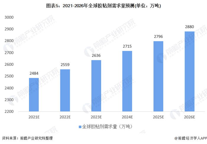 据前瞻预测,2021-2026年全球胶粘剂需求量保持年均3%的速度增长,到2026年全球胶粘剂需求量或达2880万吨。