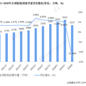 截止2019年底,初步统计,全球胶粘剂需求量为2532万吨,同比增长4.98%。2020年,由于COVID-19在世界范围内的影响,各种建筑、工业经济活动停滞了相当长一段时间。例如,根据OICA的数据,2020年前九个月的汽车产量与2019年同期相比下降了约23%,对粘合剂和密封剂的需求产生了负面影响。预计2020年,全球胶粘剂需求量为2217万吨。