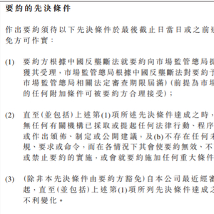 雷达财经注意到,公告中提到的要约指的是“6月16日黑石集团以5港元/股,最高对价236.58亿港元收购SOHO中国54.93%股权的交易”。而所谓的“先决条件”则涉及国家市场监管总局的经营者集中审查。