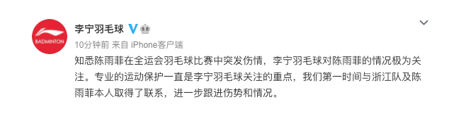 9月10日,李宁旗下官方账号@李宁羽毛球 发布消息称,知悉陈雨菲在全运会羽毛球比赛中突发伤情,李宁羽毛球对陈雨菲的情况极为关注。“专业的运动保护一直是李宁羽毛球关注的重点,我们第一时间与浙江队及陈雨菲本人取得了联系,进一步跟进伤势和情况。”