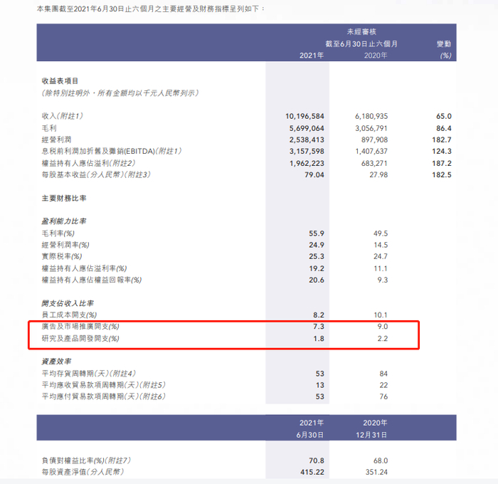 值得关注的是,李宁在营收与利润大涨的背后,相较于2020年上半年,企业研究及产品开发开支和广告及市场推广开支比例均有所下降。