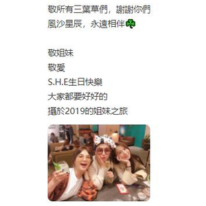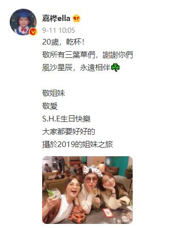 9月11日上午10时,陈嘉桦ELLa发了一条庆祝S.H.E出道20周年的微博,并放上了三人2019年的合影,并且说:大家都要好好的。