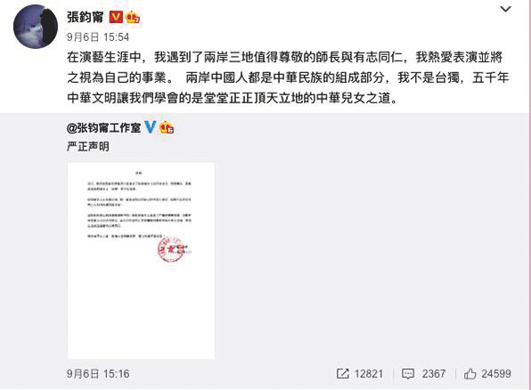 就在“小S事件”发生不到一个月,另一位中国台湾省女艺人张钧甯又被质疑存在“台独”立场问题。9月6日,张钧甯工作室和她本人火速澄清。然而她的一句“堂堂正正的中华儿女”却遭到“台独”媒体和民进党豢养的“台独”网军攻击。